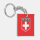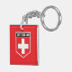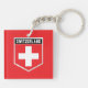 The national flag of Switzerland is infused into a shield shape that also has the country name set above the flag.