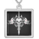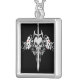 Evil skull with fangs and sword on a black background with scrolling details and Ace playing cards.