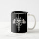 Wicked skull with fangs is pierced by a sword and is set on a black background with scrolling details and Ace playing cards.