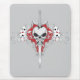 Evil skull with fangs and sword on a red background with scrolling details and Ace playing cards.