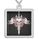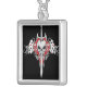 Evil skull with fangs and sword on a red background with scrolling details and Ace playing cards.