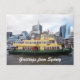 Greetings from Sydney postcard featuring the famous green and gold Sydney Ferry at King Street Wharf near Darling Harbour, Sydney, Australia - customizable postcard.