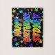 This exciting, fun, birthday-themed jigsaw puzzle design has the message "HAPPY BIRTHDAY, SYDNEY" with the characters having a colorful rainbow spectrum inspired gradient pattern, in addition to a lively star field background pattern. A colorful puzzle like this might be a fun way to send birthday greetings to somebody named Sydney. [~Z0000468]
