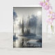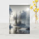 A serene winter forest scene features misty sunlight in tall frosted trees surrounding a partially frozen river for sympathy.
