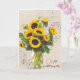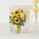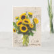 Bright yellow sunflower bouquet in a glass vase on a brick wall, abstract for sympathy.