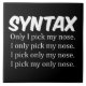 A funny typography illustration which has the word syntax and then some sentences explaining how important word placement is when you are writing. The funny design is about picking your nose. The word only is moved to different positions in the sentence to give it different meanings. I only pick my nose. This is a design that would be suitable for anyone learning or teaching the English language.