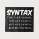 A funny typography illustration which has the word syntax and then some sentences explaining how important word placement is when you are writing. The funny design is about picking your nose. The word only is moved to different positions in the sentence to give it different meanings. I only pick my nose. This is a design that would be suitable for anyone learning or teaching the English language.