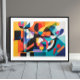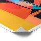 A dynamic collision of organic curves and geometric forms, this piece is a visual orchestra of color and rhythm. Rich jewel tones—teal, magenta, deep blue, orange—sweep across a glowing yellow backdrop, layered with transparency to create a sense of depth and motion. Circular and arc forms dominate, overlapping like spinning records or celestial bodies in a retro-futuristic cosmos. The black and white vertical lines on the lower left provide an anchor, almost like piano keys grounding a vibrant melody.