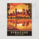 Syracuse postcard. City waterfront, Sunset over Syracuse skyline, New York State. Illustrated travel postcard in vibrant colors