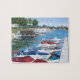 This painting is of a marina on Wellesley Island in the heart of the Thousand Islands on the St. Lawrence River. Colorful boats docked on the river.