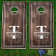 T Initial Monogram Rustic Wood Cornhole Set. Bring a touch of rustic charm to your outdoor gatherings with this personalized cornhole set. Featuring a deep wood grain background and a classic white-framed border, this design proudly displays a bold 'T' monogram surrounded by elegant scrollwork. Below the monogram, your family name is emblazoned, followed by your location and establishment year, creating a unique and personal statement. Perfect for family reunions, backyard BBQs, or as a distinctive wedding gift, this design adds a warm, farmhouse feel to any event. The rich wood texture and clean typography make it a stylish addition to your game day setup, ensuring you play in style. Great for lake house or beach houses too!