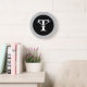 Modern custom personalized wall clock featuring your monogram initial. Shown is the letter T on a silver and black round wall clock. Initial is fully customizable. Silver background color can be changed to match your decor. Design by WebzPickz.