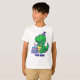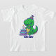 A cute little T-Rex dinosaur is smiling and wearing a birthday hat as it sits with its 2nd birthday cake. Adorable gift for your two year old!