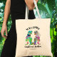 Welcome your wedding guests with this funny colorful psychedelic dinosaur themed wedding welcome tote bag with T Rex bride and groom in purple blue pink yellow green and orange hues with Jurassic jungle foliage and modern whimsical typography script. Add all the days survival favors like bottled water, tablets for headaches and toys and table games for children attending the event. Easy to customize with the bride and grooms names and the wedding date. Unique multicolored Tyrannosaurus rex dino bride and groom illustrations. original artwork by artist Catherine Sweetman