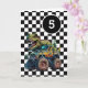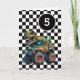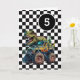 A dinosaur monster truck 5th birthday card for boys. Featuring a black and white checkered background on the front with a place you can easily personalize the age if needed. A Tyrannosaurus rex dinosaur on top of a monster truck will delight all dinosaur and monster truck fans.