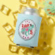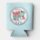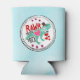 A can cooler with an image of a green t-rex wearing a black top hat with hearts all around. Text says Rawr means I love you in t-rex.