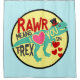 A shower curtain with an image of a green t-rex wearing a black top hat with hearts all around. Text says Rawr means I love you in t-rex.