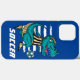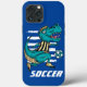 A cool phone case for soccer players and enthusiasts, this design has a bright blue background with a colorful T-Rex dinosaur in teal green with a yellow and black referee striped shirt kicking a soccer ball. There is also a text template to personalized with a child's name or other desired text.