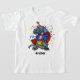 Rawr! A T-Rex superhero wearing a birthday hat is surrounded by a colorful burst of confetti. Cool 5th birthday gift for your five year old.