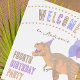 Customized by you, this cute dinosaur birthday WELCOME sign is a great way to greet and direct your guests into your child's dinomite party. Easy to edit for any age needed, all you need to personalize on this dino welcome sign is the name and birthday age, but everything can be customized except for WELCOME in the colorful letters. WELCOME in curved text is bordered by dark peach tan dots in an arch. This brown T-Rex in a party hat and balloons was designed for both boys and girls in a gender neutral pallet of tan, brown, peach, purple and blue.