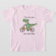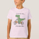 A T-shirt with a funny T-Rex cartoon: T-Rex on a bike. Text: T-Rex tiny arms loves dutch bikes"