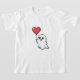A charming cartoon drawing of a small white ghost floating while holding a bright red heart-shaped balloon on a thin string. The ghost features a joyful expression with large black eyes, a happy smile, and pink cheeks, rendered with clean, bold black outlines against a plain background.