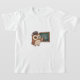 An adorable cartoon brown owl character depicted as a smart teacher or professor. The owl features large expressive eyes, a grey flat cap, and a classic monocle attached by a chain. It stands confidently while pointing a piece of white chalk at a green wooden chalkboard, which displays written mathematical equations and a physics atom diagram.