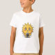 A cute cartoon sun with spiky rays and a glossy golden face, looking exhausted with heavy-lidded eyes and purple under-eye shadows. It hugs a steaming mug of dark coffee, cheeks blushing pink, with sketchy shadow lines beneath and clean bold outlines for a fun sticker-style look.