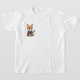 This design showcases a charismatic cartoon fox dressed in full rock and roll attire. The cute orange and white fox has large, expressive eyes and a confident smile while striking a dynamic pose. It is wearing a black studded leather biker jacket over a studded choker necklace, paired with ripped blue denim jeans. The fox is actively playing a vibrant red double-cutaway electric guitar, with small yellow lightning bolts and star accents radiating around the instrument to convey musical energy against a plain background.