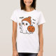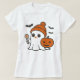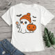 This playful Halloween-themed t-shirt design features a cute ghost wearing an orange beanie, holding a festive lollipop, and accompanied by a smiling jack-o'-lantern. With friendly bats fluttering around, this charming illustration blends spooky and adorable elements, making it perfect for celebrating the Halloween season in style!