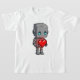 A cute metallic robot with a boxy head and glowing blue eyes, gently holding a bright red pixel-style heart. The smooth gray surfaces contrast beautifully with the vibrant heart glow, creating a warm emotional focus. Clean lines, subtle textures, and a soft cartoon style give this illustration a charming balance between futuristic and adorable, expressing innocence, warmth, and digital love.