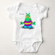 This image features a white baby garment printed with a cartoon green alien sitting cross-legged in a relaxed pose, wearing a striped shirt, blue jeans, and sneakers — tongue playfully sticking out. The text “your text” above suggests this is a customizable design. The quirky, laid-back character makes it a fun and imaginative choice for personalized baby wear — perfect for sci-fi fans or as a whimsical gift for little extraterrestrials.