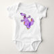 This photo shows a white baby outfit featuring a cartoon-style purple dinosaur with orange spots, captured in a funny and energetic pose. The cheerful design adds a lively and whimsical touch to children’s clothing.