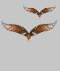 Birds soaring in together. One large and one small bird. Each created with two brown feather images to make the wings. Graphic components of oval and line create the heads and beaks.