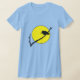 Hummingbird on branch, silhouette against a yellow sun. Blue shirt simulates the sky.