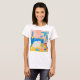 an illustration with a funny white cat sitting on a table in a bright yellow and pink room. A T-shirt with a cheerful print for a woman in bright shades.