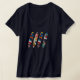 A black t-shirt with geometric patterns and a mix of colors.