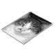 Greyscale photograph of a tabby-and-white cat cropped to show closeup of face.