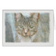 Brown or gray striped domestic shorthair or tabby cat, close up of face, digital photo with watercolor treatment added