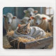 A tabby cat rests comfortably wrapped in a blanket sleeping in a wooden barn feed trough filled with hay and sheep in the background