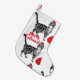 Perfect! Exactly what I ordered! I uploaded a picture of my blue chow, and the screen print was incredible. the back side of the stocking was the red and black checkered print. my puppy's name was also printed on the cuff of the stocking. PERFECT! Highly recommend this product! My puppy's name was screen printed onto the cuff of the stocking, the font was perfect!