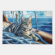 A tabby cat is lounging on a coiled blue ropes on the deck of a sailing vessel, basking in the sunlight with clear blue skies and calm seas in the background