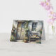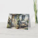 Tabby cat laying on an old bench in front of rustic cottage blank note card.