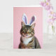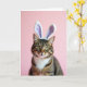 This card features a close-up portrait of a tabby cat set against a smooth pastel pink background, wearing a soft headband with tall bunny ears lined in white and pale lavender 🐰. Gentle, diffused lighting brings out the warm brown coat and dark stripes, keeping the scene calm and inviting. The cat’s yellow-green eyes look straight ahead with a steady, affectionate gaze, like it’s posing for a friend who’s just out of frame 🐇. Fine white whiskers spread from a small pink nose, adding crisp detail against the plush fur on its chest. A simple Easter greeting sits near the top in white lettering, with a smaller line of text centered below in a light lavender tone. The overall setup feels like a sweet, cozy studio moment, with the costume touch adding a soft, teasing kind of charm. The bunny ears stand upright above the cat’s head, their lavender inner panels clearly outlined against the pink backdrop.