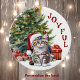 On the front of this Holiday ornament is an adorable gray tabby kitten wearing a red and white Santa hat. The kitty sits in front of a decorated Holiday tree, and is wrapped in a string of festive lights. Red text at the side says "JOYFUL". On the back, red and green text says MERRY CHRISTMAS", and there are additional text fields for you to customize. Wonderful to give to a grandson, granddaughter, son, or daughter.