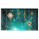 Gold, antique keys with gears and dials hang on gold chains on luminous green background.