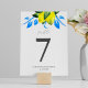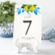 This wedding table number features watercolor lemons in shades of yellow with blue and green botanical leaves. Use the template fields to customize with your table numbers, names and wedding date. To see the matching wedding stationery suite visit www.zazzle.com/dotellabelle