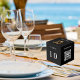 For restaurant, cafe, bar tables, Personalize and add your business logo, table numbers and QR code for your menu. Black background, white text. You can add your brand color in the design tool.