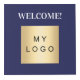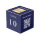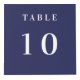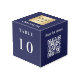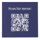For restaurant, cafe, bar tables, Personalize and add your business logo, table numbers and QR code for your menu. Navy blue background, white text.
