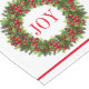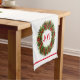 This holiday table runner is shown in White with a festive Christmas wreath print with text saying Joy.
